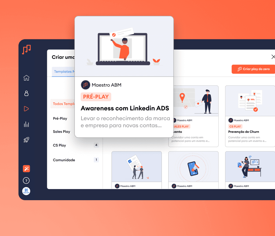 A plataforma oferece templates já validados divididos por categorias: Pré Play, Sales Play, CS Play e Comunidade. O objetivo é facilitar a execução com boas práticas ao executar as campanhas.